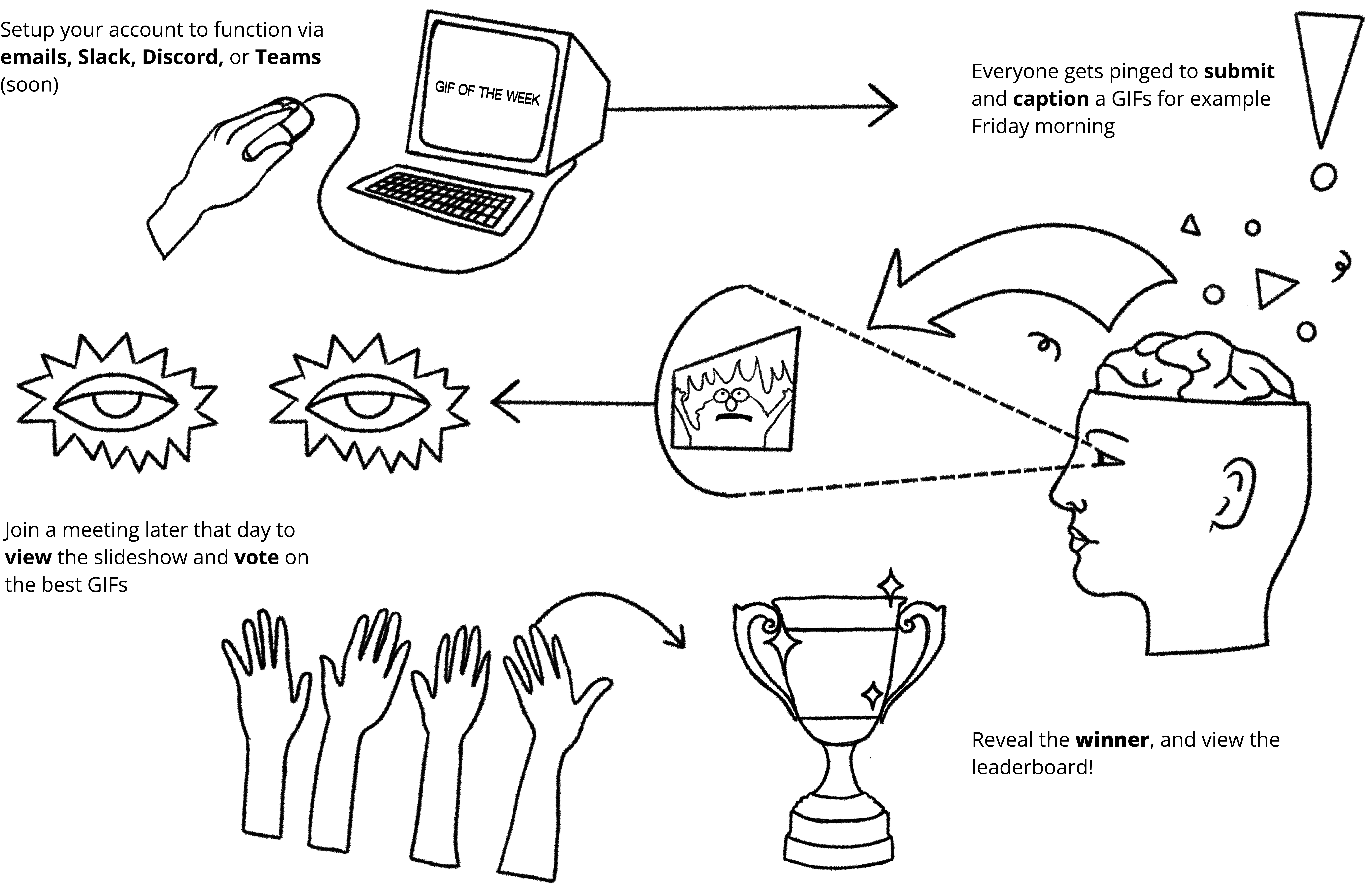 Setup your account to function via email, Slack, Discord, or Teams (soon). Everyone gets pinged to submit and caption a GIF. Join a meeting later that day to view the slideshow and vote on the best GIFs. Reveal the winner, and view the leaderboard!